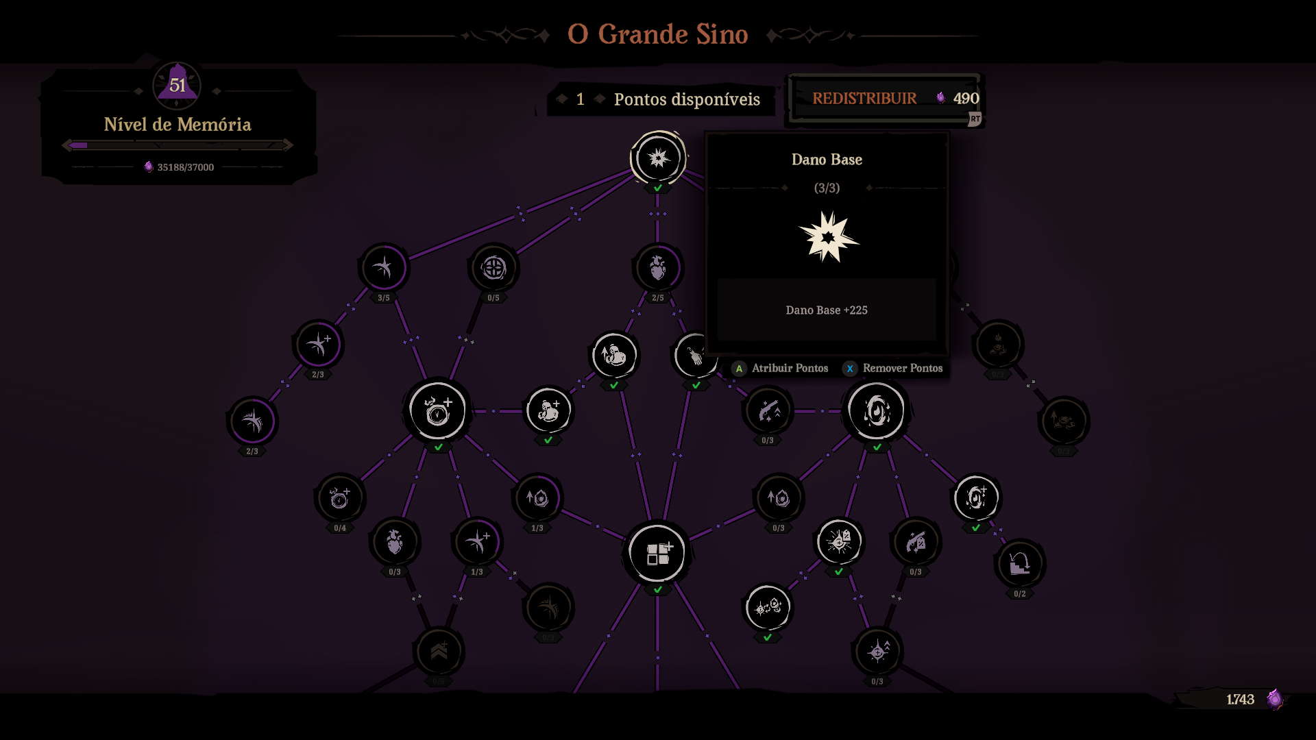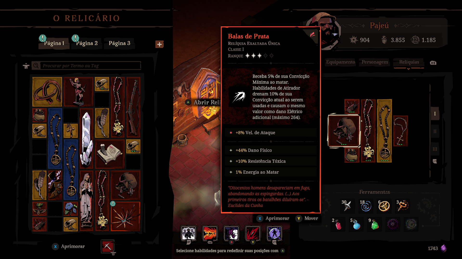 Além dos itens, existe um outro recurso permanente entre uma run e outra: os chamados Fragmentos de Alma. Esse recurso serve como moeda para comprar novos itens, melhorar os já existentes e adquirir novas habilidades. Coletar uma determinada quantidade delas também garante pontos de habilidade, que podem ser utilizados na extensa árvore de habilidades de Pajeú. Essas habilidades são permanentes e garantem diversos bônus passivos, como mais vida, mais dano ou mais tempo em seu cronômetro.