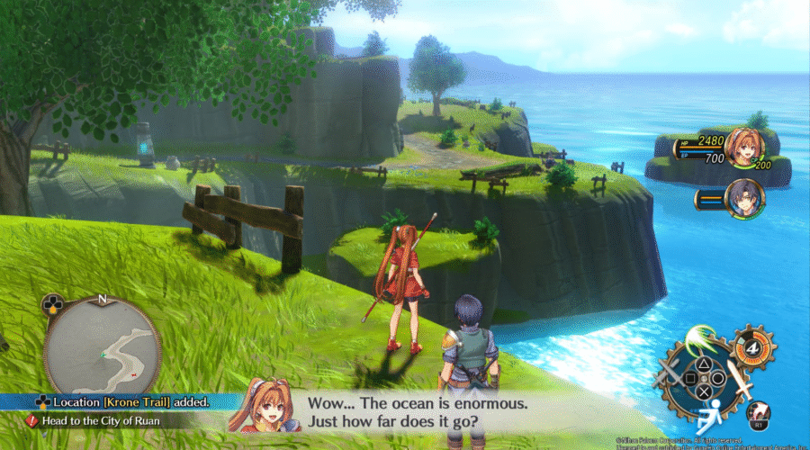 Trails in The Sky é um RPG peculiar – tanto em sua versão original quanto nesse remake. O mapa de Liberl é pequeno e pouco variado, mas isso não é necessariamente algo ruim a longo prazo. Explico. Durante esse jogo, Estelle e Joshua exploram ambientes que incluem campos floridos, planícies gramadas, florestas… Mas você não vai ver biomas variados como desertos, cidades nevadas ou vulcões fumegantes. O mundo da franquia é muito mais vasto do que você conhece nesse jogo, e o objetivo aqui é introduzir o jogador, lentamente, a este novo mundo.